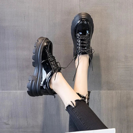 Orthopädischer Lackmokassin für Damen mit Keilabsätzen im Punk-Stil