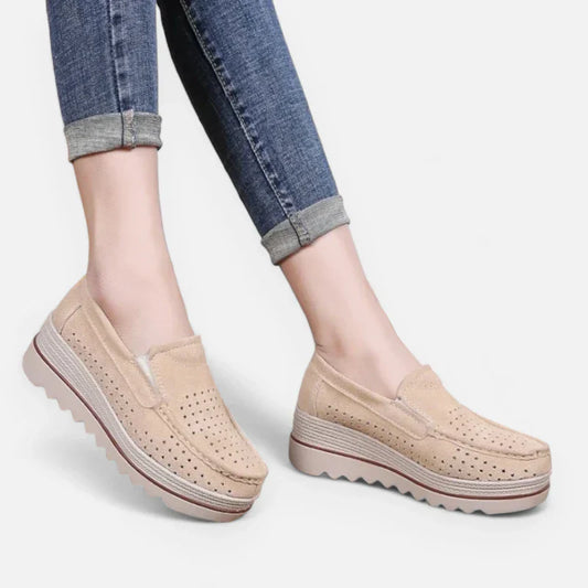 Orthopädischer Damenmokassin mit durchbrochenen Keilabsätzen aus Wildlederimitat