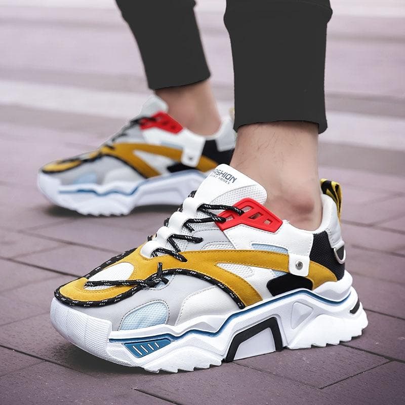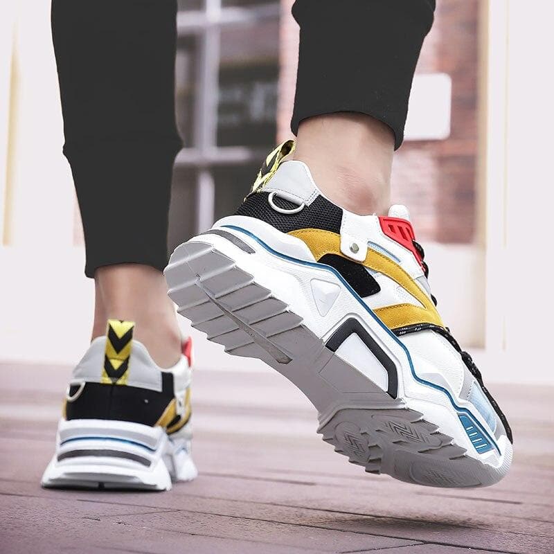 👟 Mutiges und Trendiges Design: Auffälliges Senfgelb kombiniert mit knackigem Weiß, Schwarz und Rot für einen schicken urbanen Look.