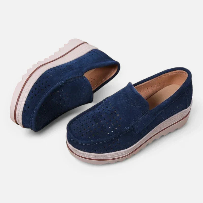 Orthopädischer Damenmokassin mit durchbrochenen Keilabsätzen aus Wildlederimitat