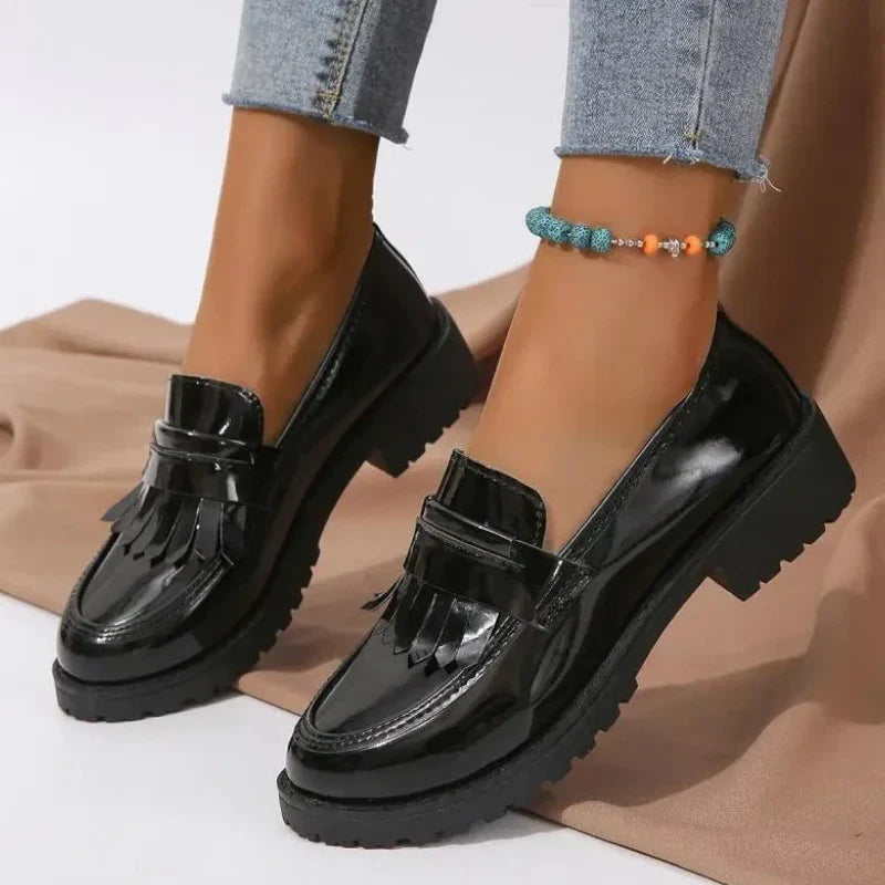 Stylische Damen-Lackmokassins mit orthopädischer Unterstützung und trendigen Fransen