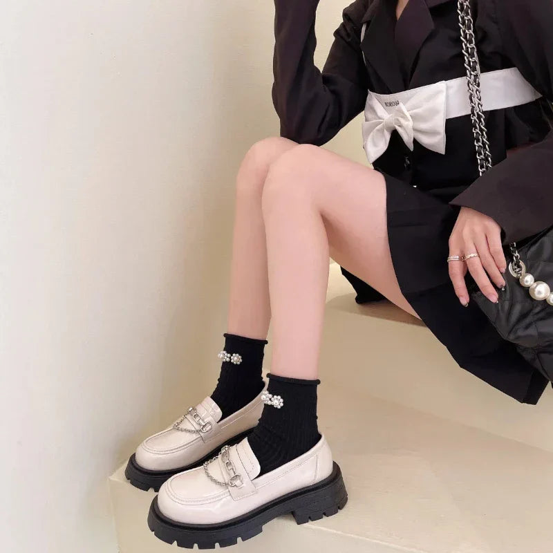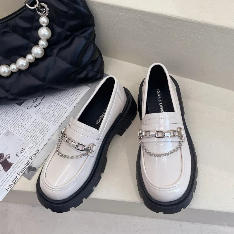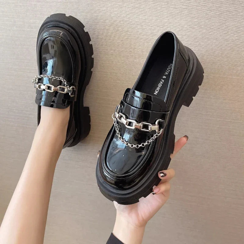 ✨ Elegantes Design: Diese Mokassins verfügen über eine schicke Lackoberfläche mit dekorativen Ketten, die einen rockigen Geist mit einem raffinierten Look kombiniert.